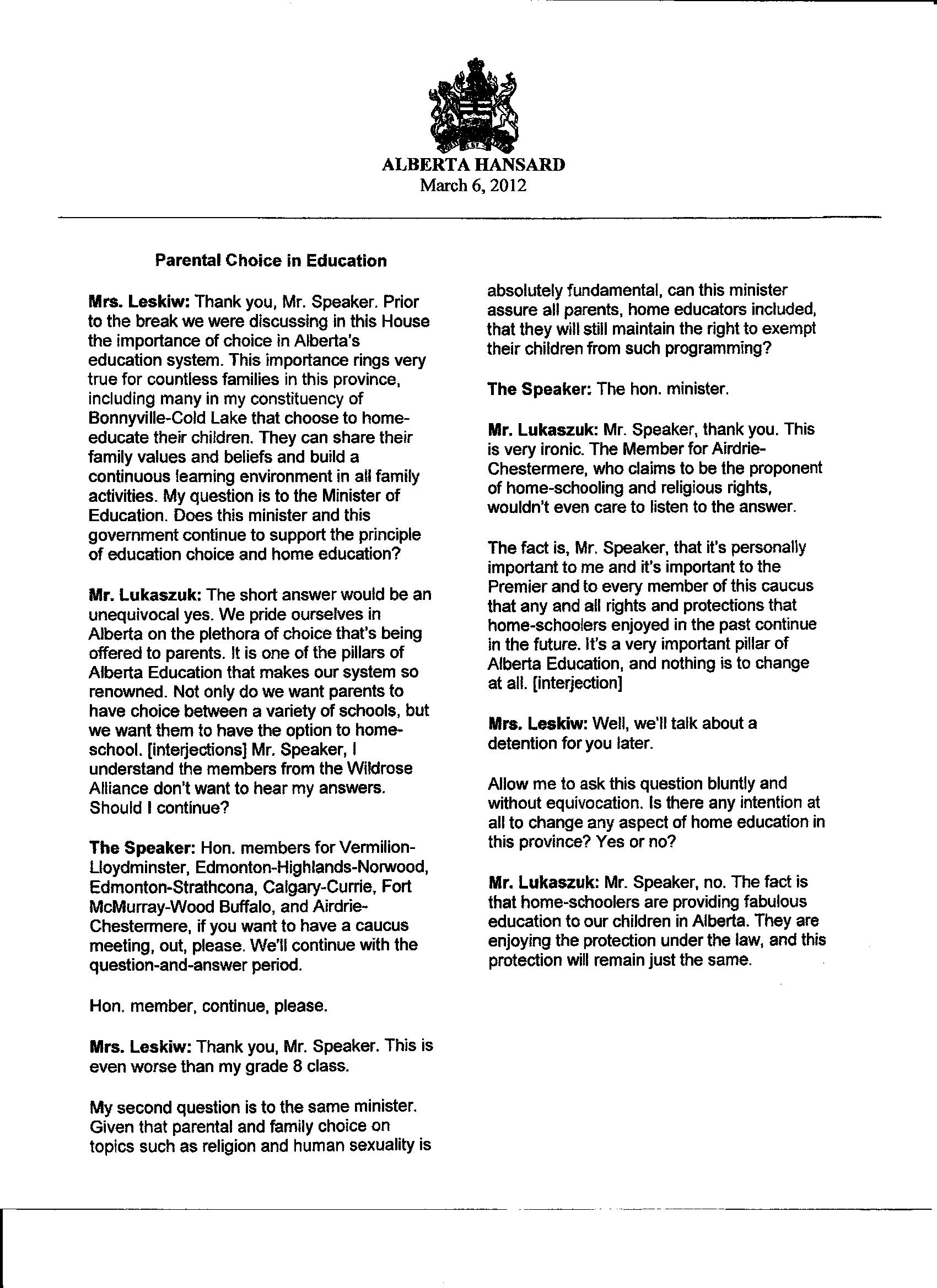The Alberta government is not banning home educators from providing religious instruction to their children, nor is it requiring parents to provide instruction that opposes their faith. For your reference attached is a record of Minister Lukaszuk’s March 6 response to a question in the Alberta Legislature about homeschooling. The Education Act passed second reading on March.