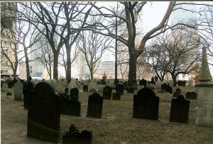 Looking towards Ground Zero from St. Paul’s Chapel. Take note of the blackened headstones as a result of 9/11 and a few of the Sycamore trees that protected the church that day.