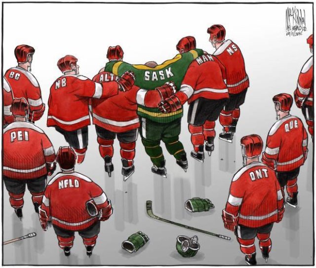 This editorial cartoon by Bruce MacKinnon, an award-winning cartoonist with the Halifax Chronicle Herald, represents in a powerful way how all Canadians feel about this tragedy:
