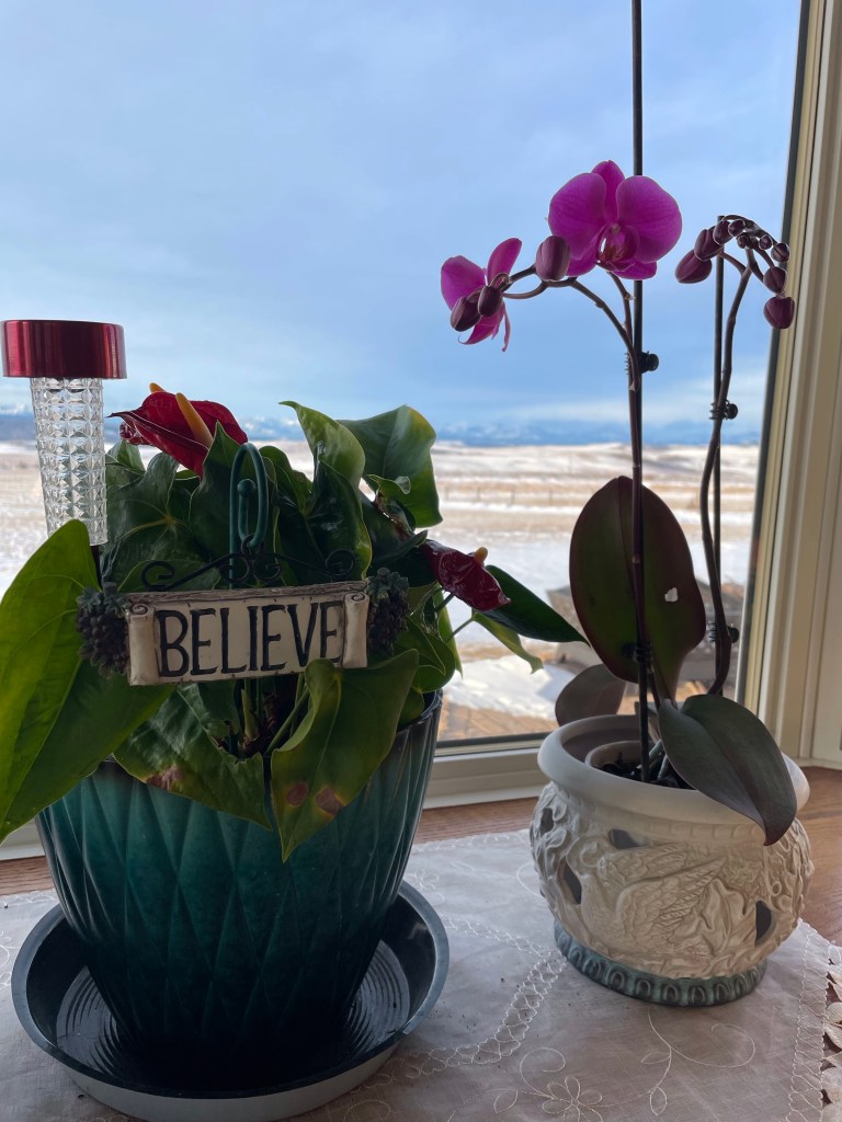 I love when I see summer flowers blooming in winter! I had to snap a picture of my orchid and anthurium blooming side by side in the window.